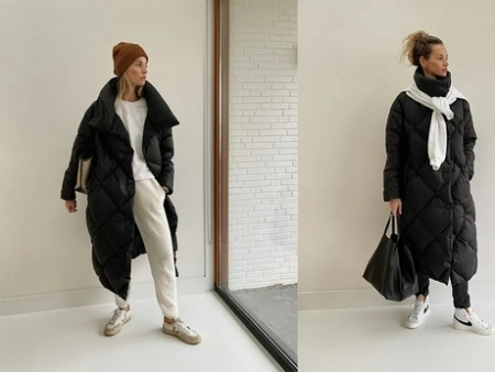 如果说‘上松下紧’的穿搭方式凸显了下身的纤细修长,那么那一份轻盈感一定是白色休闲鞋带来的~来对比看看同样是all black羽绒服造型,左图明显在视觉上更加透气。( 没有说图二博主穿得不好的意思!一个谨慎发言的大动作 )