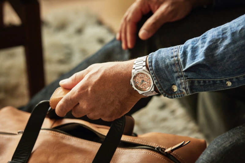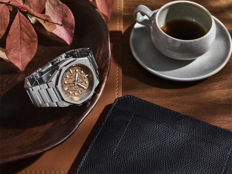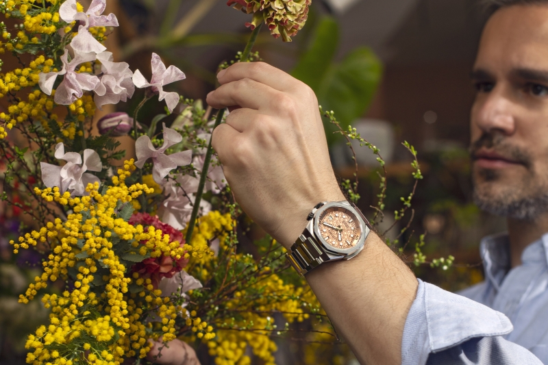 商务能够潮流动感,男性也可以充满活力色彩。Series 8 · 890“樱云”的灵感来自春日胜景——樱花粉云。铜粉色表盘设计融入樱花元素,形成特别的几何图案,粉嫩的樱花柔和了冷硬的金属质感,在保留Series 8系列一贯的视觉形象的同时更添春日暖意,如同整洁无一丝褶皱的西服下,那不经意间流露的温柔儒雅。夜光涂层的几何图形时标和宝剑样式的指针,不仅让时刻清晰易读,更让现代风格的腕表多了一抹趣味灵动。
